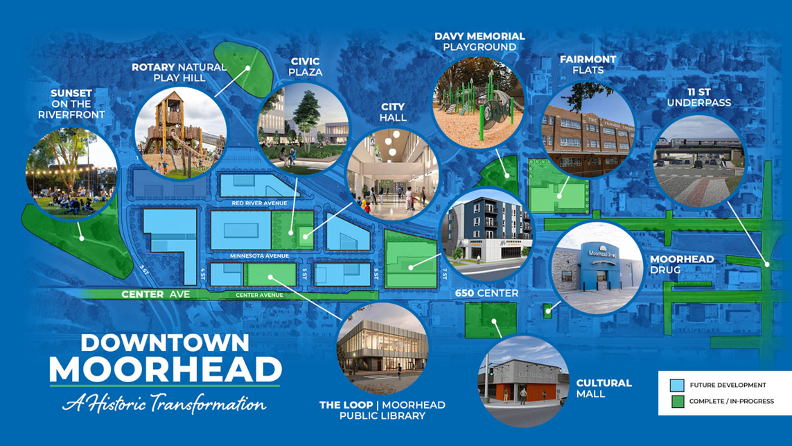 - Community Anchors: The Loop | Moorhead Library, renovated City Hall, and Civic Plaza for events and gathering.