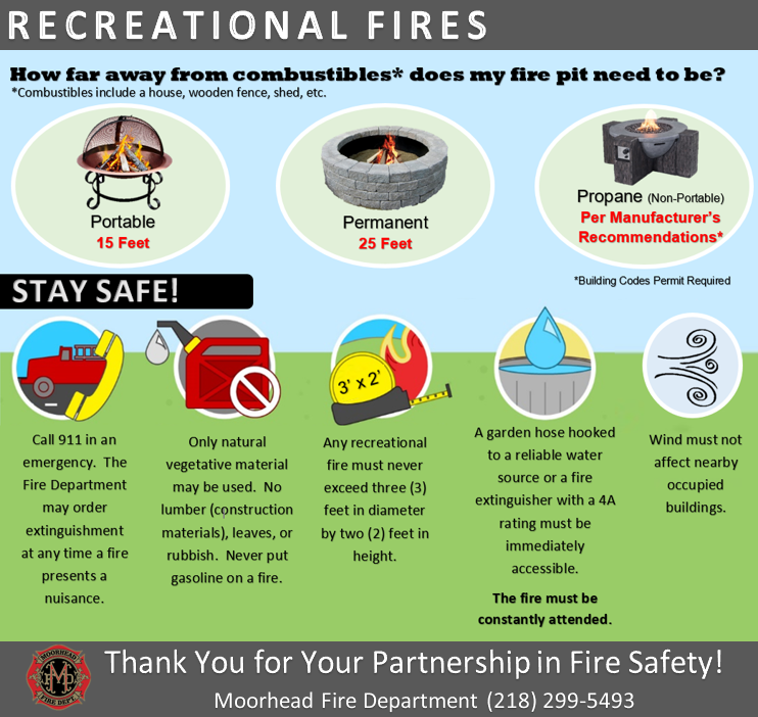 - Recreational fires must be at least 25 feet from all buildings or combustible materials. Combustible materials are things such as wood, paper, and plastics. Portable outdoor fireplaces have a slightly different requirement and must be a least 15 feet from all combustibles and follow manufactures safety requirements. More detailed information on portable outdoor fireplaces can be found below.
