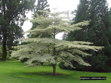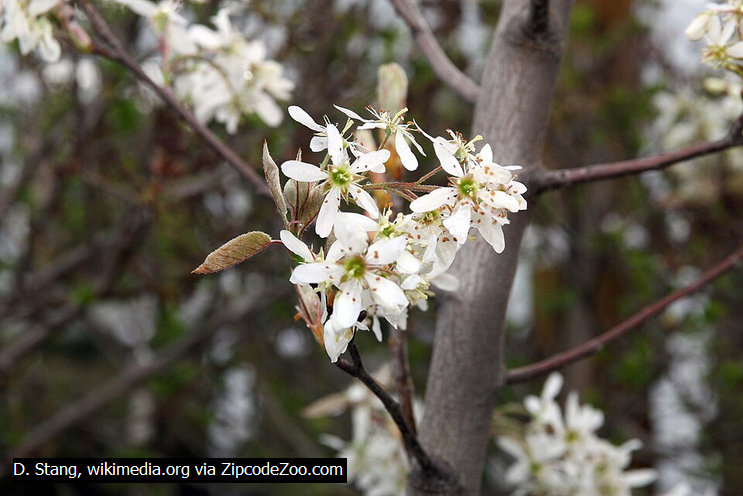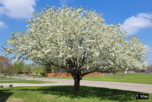 - Has white flowers in spring and leaves turn orange or red in the fall.