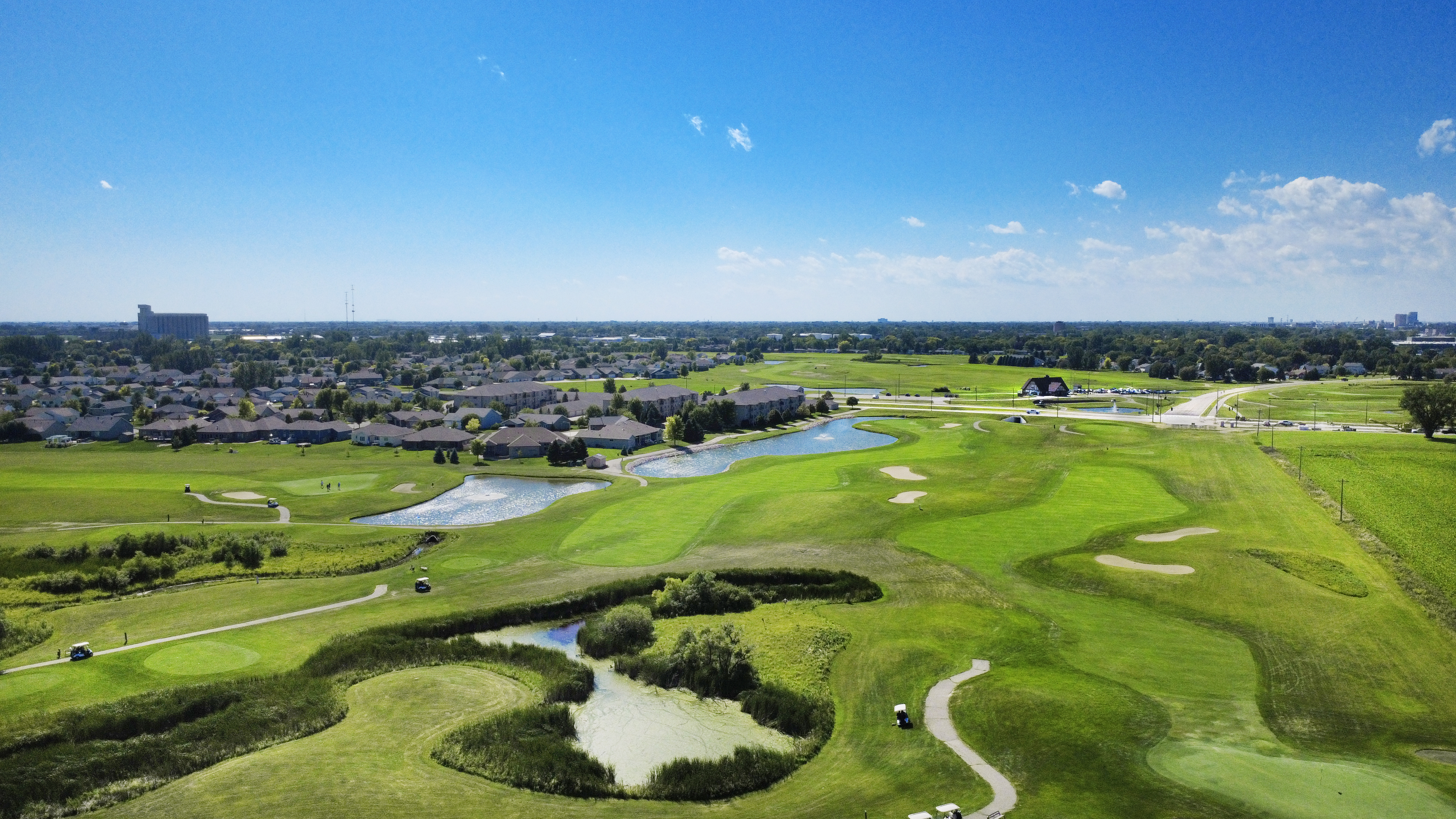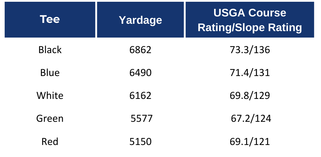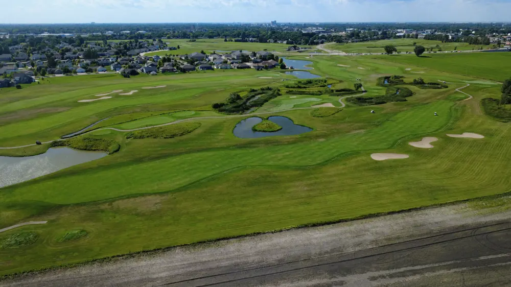 The Meadows is a Joel Goldstrand design fashioned after the traditional Scottish links courses of yesteryear. Complete with mounding, tall prairie grasses, wildflowers, bunkers, a hidden creek and prevailing winds, golfers at The Meadows are transported to a far-off Scottish links course with challenges over every shot. Unique to the Meadows is a design in which no trees come into play on the course. In addition, the layout includes three six-hole "loops" with the greens of the 6th, 12th and 18th holes all returning to the clubhouse. With five sets of tees, yardage ranges from 5,150 at the forward tees to 6,862 at the championship tees.